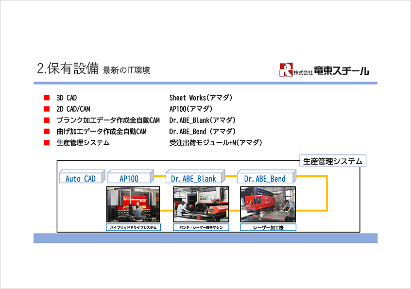 | 平成27年(2015年)8月 | レーザー加工機(アマダ)1台 / ハイブリッド・ドライブシステム / ベンディングマシン(アマダ)1台 導入 |